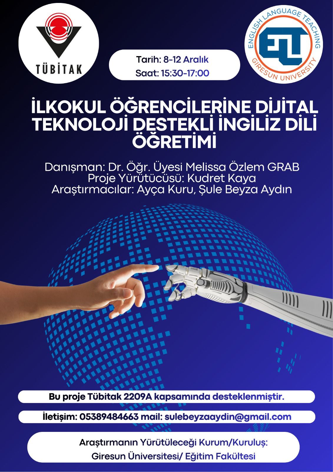 TÜBİTAK 2209-A kapsamında desteklenen proje, Giresun Üniversitesi Eğitim Fakültesi İngilizce Öğretmenliği Programı öğrencileri tarafından gerçekleştirilmiştir. Projenin yürütücülüğünü Kudret Kaya, araştırmacılığını Şule Beyza Aydın ve Ayça Kuru üstlenmiş; danışmanlığını Dr. Öğretim Üyesi Melissa Özlem Grab yürütmüştür.